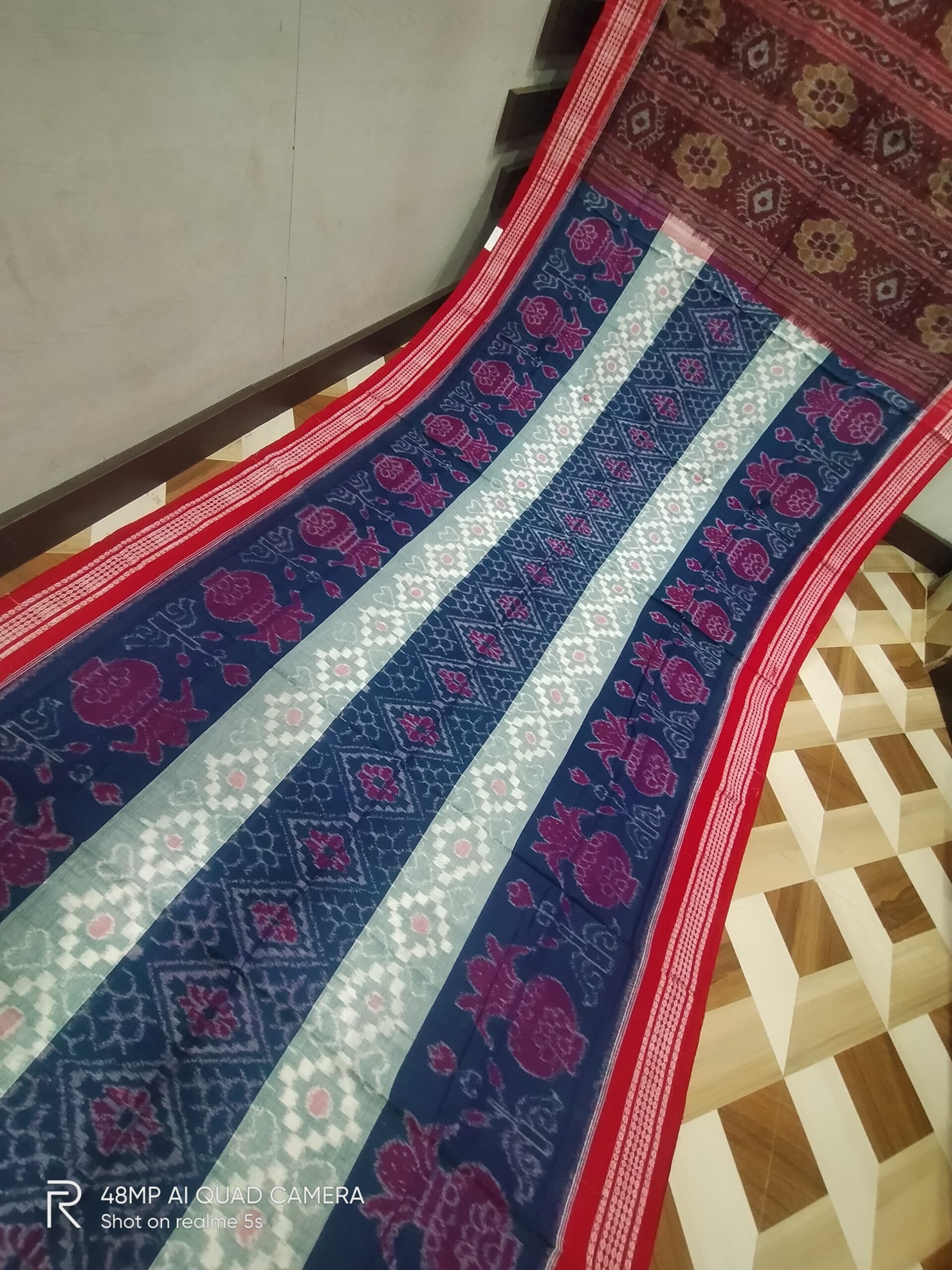 Be the first to review “Sambalpuri Handloom Blue,White & Red Entire Design Bunakar Bandha Saree”